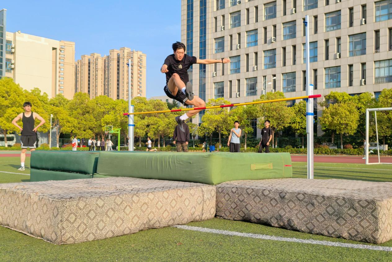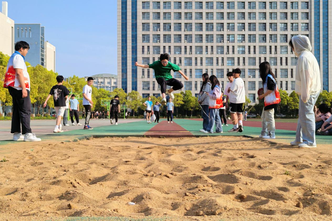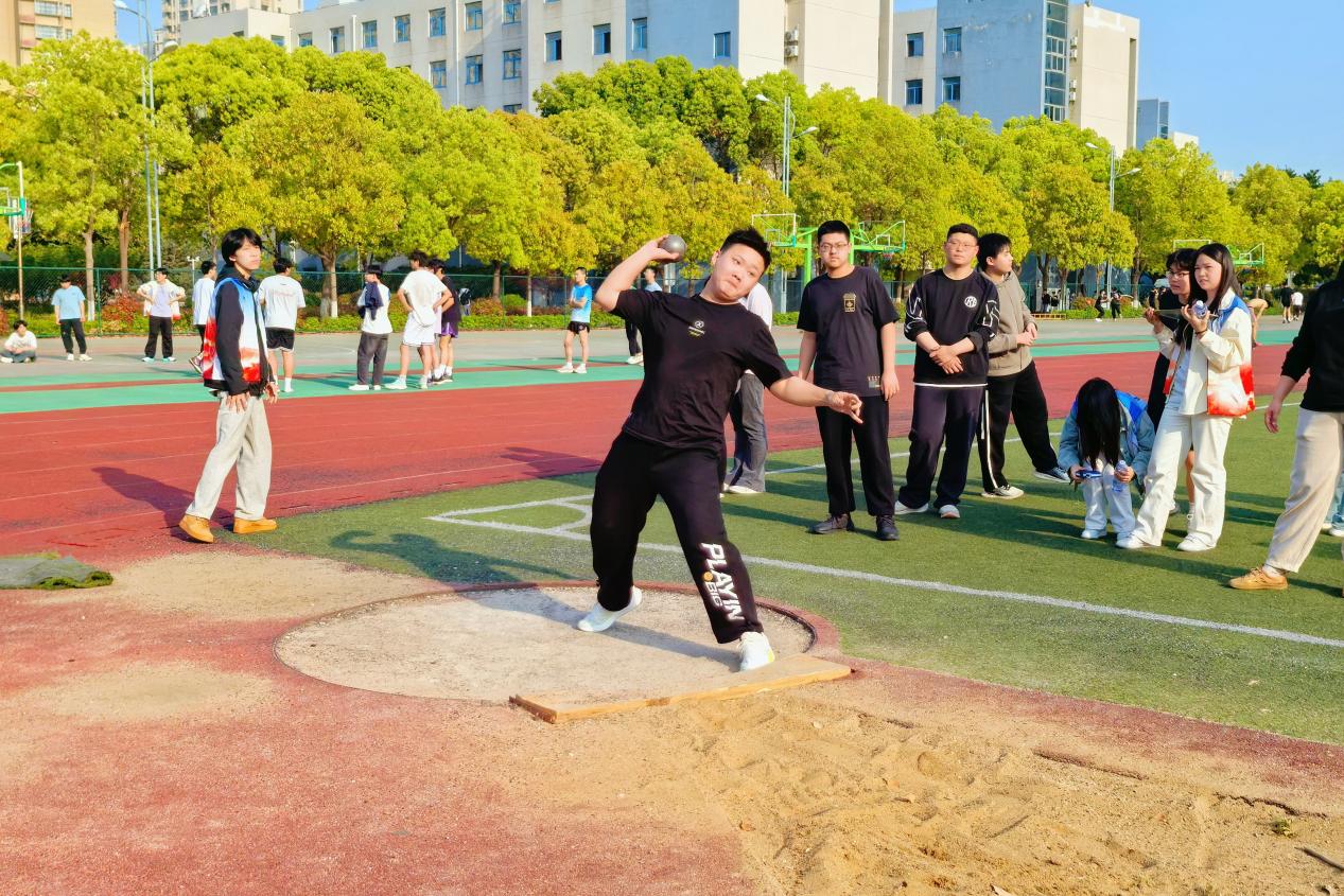 沙坑边,选手们俯身助跑,临近踏板骤然发力,身躯如弹簧般腾跃而起,在半空划出一道道优美的弧线,继而稳稳落地。铅球项目中,选手们右手紧握铅球抵在锁骨处,身体后倾成满弓状,旋转、发力、投掷……动作连贯有力。跳高赛场气氛紧张而热烈,随着横杆不断升高,选手们纷纷挑战自我极限。有的同学尝试几次后失败,但仍以顽强毅力反复冲刺,围观学生纷纷为他加油鼓劲。