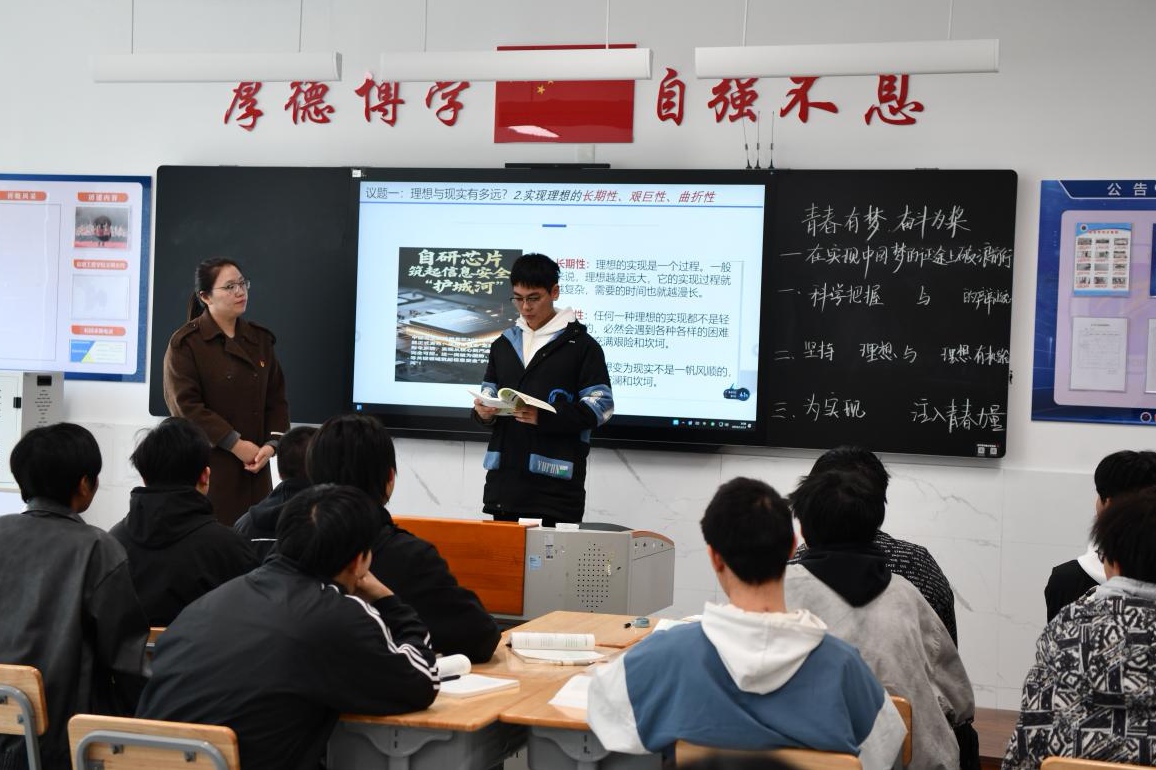 随后,盐城机电分院沈敏老师带来名师示范授课《青春有梦,奋斗为桨——在实现中国梦的征途上破浪前行》。课程以“理想与现实的辩证统一”为切入点,先通过《浪浪山小妖怪》动画片段引发学生对“理想困境”的共鸣,再结合龙芯团队攻坚芯片技术、中国算力网青年团队突破技术瓶颈等榜样案例,引导学生理解“个人理想融入社会理想”的重要性。课堂尾声的“青春奋斗承诺”环节,学生主动分享“如何以专业能力助力国家发展”,现场参与度超90%,将“价值引领”融入情感表达,彰显思政课的育人温度。